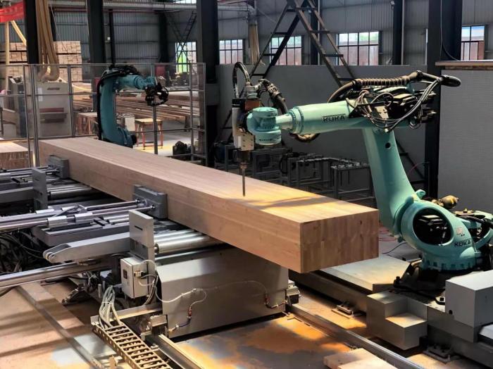 第一次接触到机械手臂这个科技概念是在一次交流会上,加上经常出国考察学习,秦丝思的直觉告诉她“智能建造”代替传统人工一定是未来的趋势和引领。将建造过程“3D to 3D”的想法开始萌生。2019年秦丝思组织成立了满木科技。这支团队核心都来自华科系,在各方资源的支持下,他们开始深耕建筑领域的智能化产业机器人系统、机器算法、智能制造与人机交互等核心技术。之后,秦丝思又在先生的支持下投入了不菲的资金,从德国采购了两台工业级的 KUKA 机器人手臂、配合研发的第一款参数化建筑机器人算法平台。这个二次开发从此实现了木梁从“三维图纸到成品”的一键生成,整个操作过程高度智能化、便捷化。产线对设计模型中的几何数据精准把控,将误差控制在 1mm 内,为装配预制构件的现场拼装提供了有力保证。更可加工各种异形曲面和复杂连接。