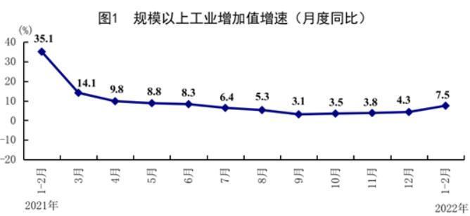 1-2月份,全国规模以上工业增加值同比增长7.5%,比2021年两年平均增速加快1.4个百分点。其中,高技术制造业和装备制造业增加值同比分别增长14.4%和9.6%,新能源汽车、工业机器人和太阳能电池产量同比分别增长150.5%、29.6%和26.4%。