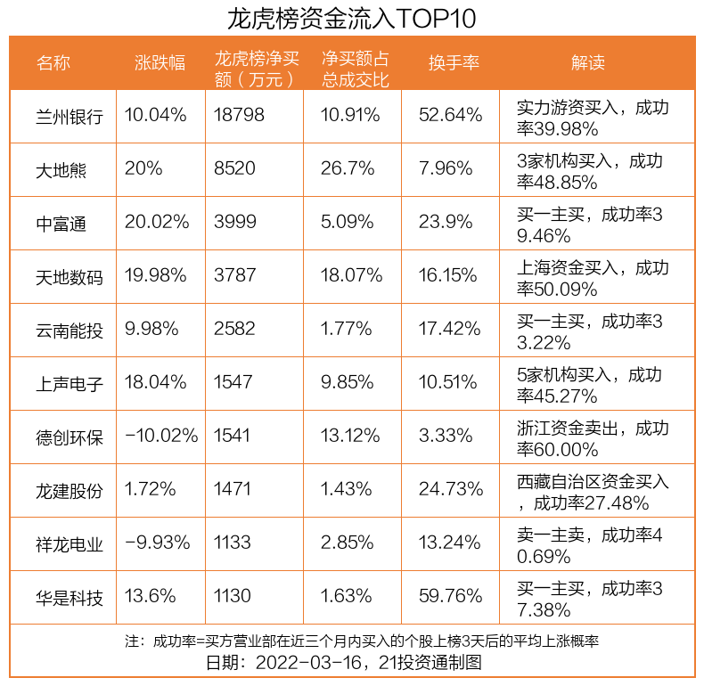 3月16日,上证指数上涨3.48%,深证成指上涨4.02%,创业板指上涨5.2%。盘后龙虎榜数据显示,共有39只个股因当日异动登上龙虎榜,资金净流入最多的是兰州银行(001227.SZ),达1.88亿元。