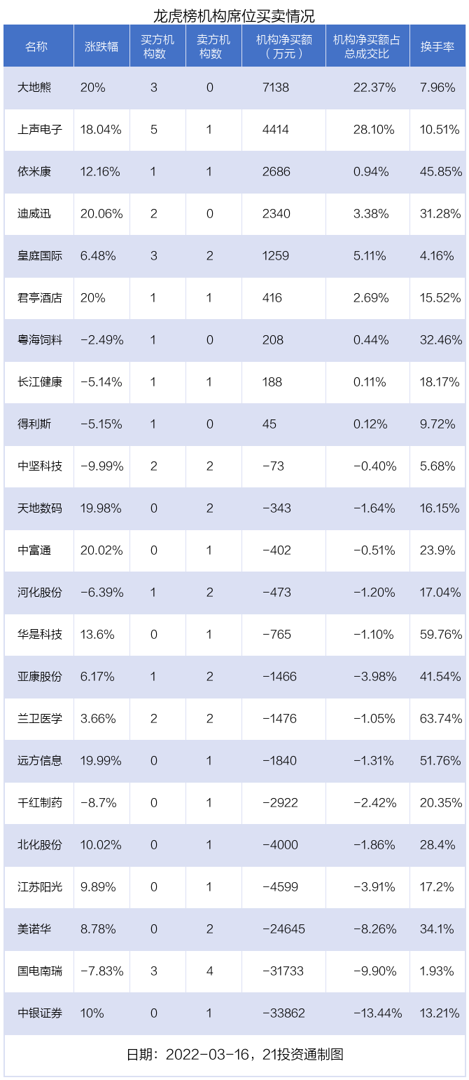 3月16日,23只个股龙虎榜出现了机构的身影,机构合计净卖出8.99亿元。具体来看,机构净买入9股,净卖出14股。