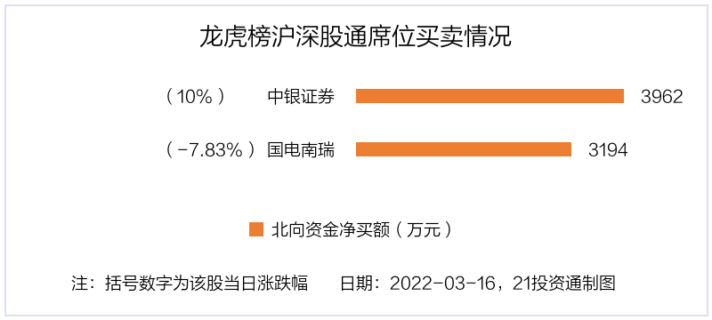 3月16日,北向资金参与龙虎榜中的个股共有2只,合计净买入7155.34万元,均为沪股。