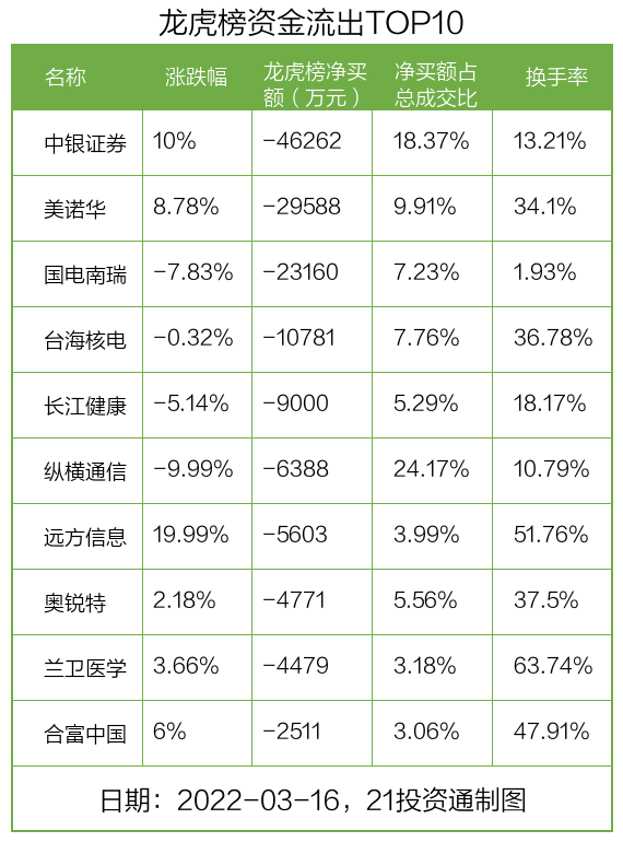 而龙虎榜中资金净流出最多的是中银证券(601696.SH),被净卖出为4.63亿元,占总成交金额的18.37%。中银证券收盘上涨10%,换手率为13.21%。