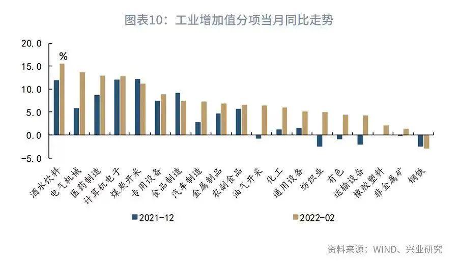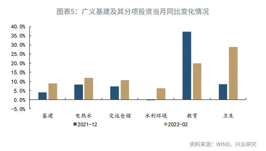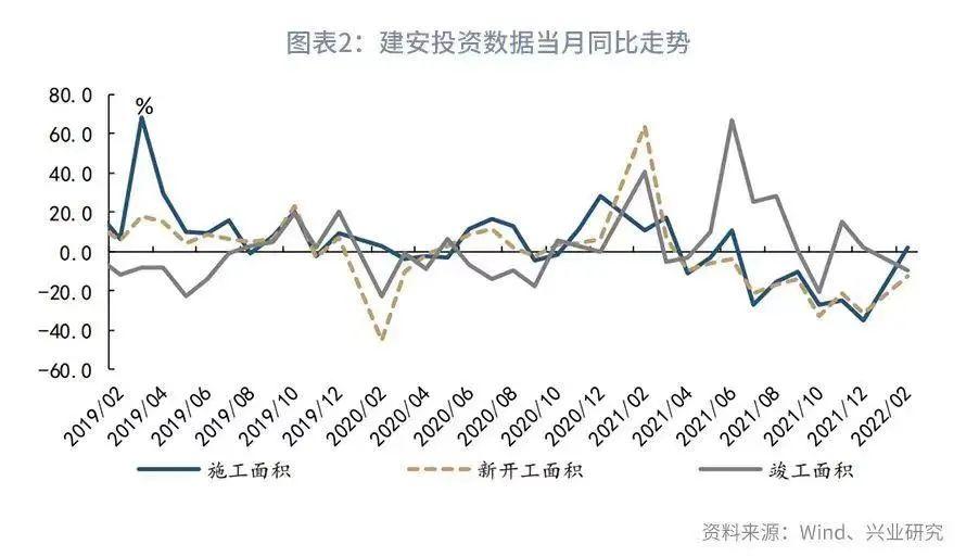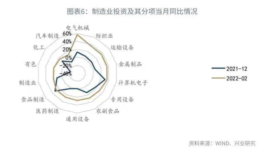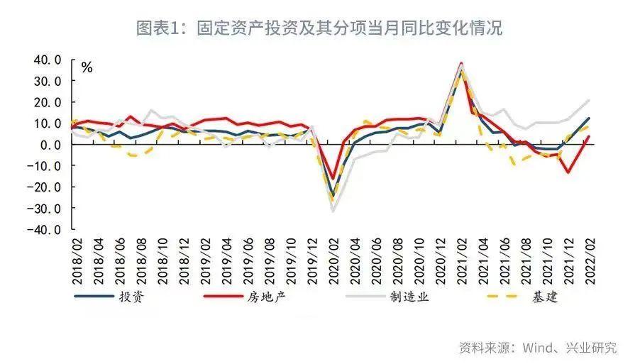 2022年1-2月固定资产投资累计同比录得12.2%,大幅超出市场预期。制造业投资、基建投资如预期回升之外,房地产投资自谷底大幅反弹,由负转正成为投资动能超预期改善的最主要动能。