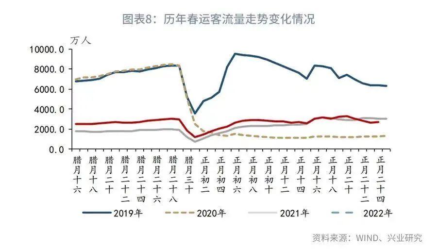 社零数据回升一方面是因为低基数效应的影响。另一方面,2022年返乡过年的居民数量较2021年有所回升,消费场景增多,带动消费需求回升。两者共同推动1-2月社零同比读数的大幅回暖。