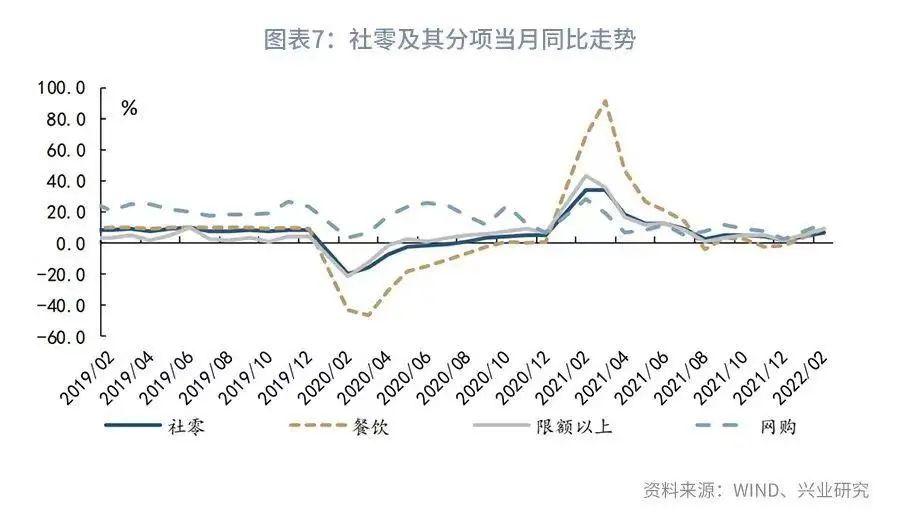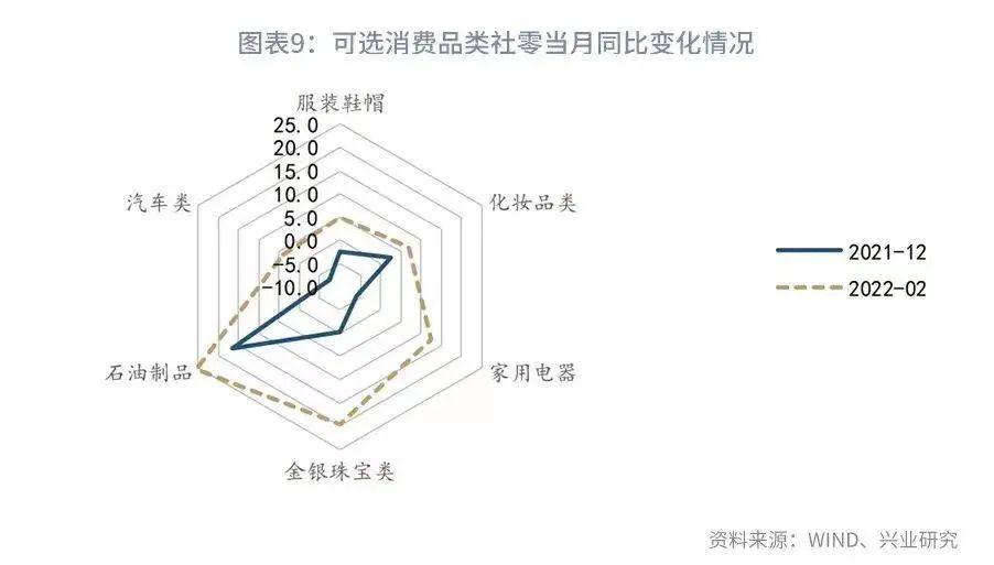 从各类商品分项的表现来看,2022年1-2月居民的粮油食品、日用品等必需品消费走弱,但可选消费品增速明显回升。其中,服装鞋帽、化妆品、家用电器、金银珠宝、通讯器材等品类零售额当月同比分别回升了7.1、4.5、12.7、19.7和4.5个百分点。在可选消费品之外,近期汽油价格持续上涨,石油品类零售额当月同比回升9.0个百分点至25.6%。同时,近期汽车(3.9%)消费稳步改善亦支撑社零表现。