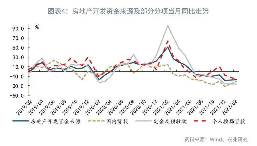 不过从房地产企业的融资数据来看,当前房地产投资高增的持续性或将面临较大压力。2022年1-2月房地产开发资金来源当月同比仅录得-17.7%,其中国内贷款、按揭贷款增速当月同比分别为-21.1%、-16.9%。房地产业信贷投放持续低迷。同时,近期房地产市场销售仍在持续走弱,房地产企业定金及预收款当月同比录得-27.0%。房企的融资压力改善幅度相较于房地产投资的改善幅度明显偏低。后续的资金压力或将一定程度上制约房地产投资表现。