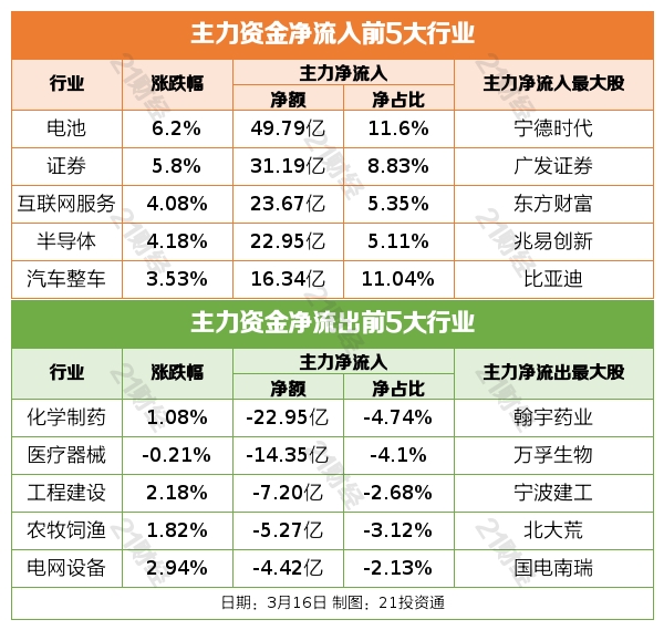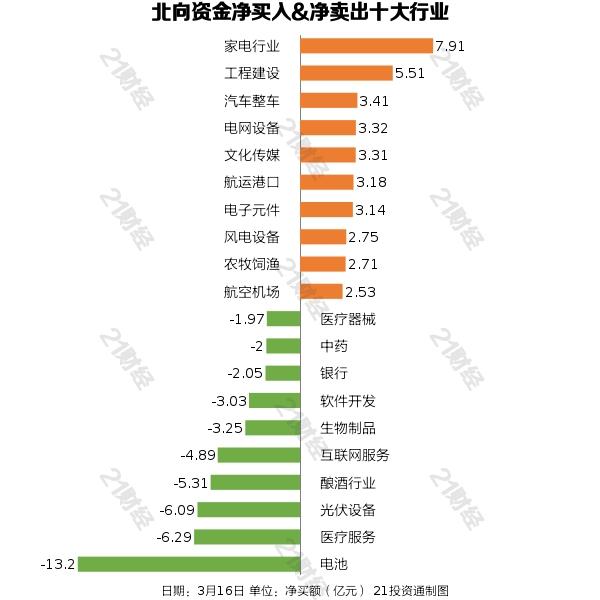 从净买入金额来看,北向资金增持了57个行业,其中家电行业居首,净买入金额达7.91亿元,其次是工程建设行业,净买入5.51亿元。北向资金减持了43个行业,其中电池最多,净卖出金额达13.20亿元,其次是医疗服务行业,净卖出6.29亿元。
