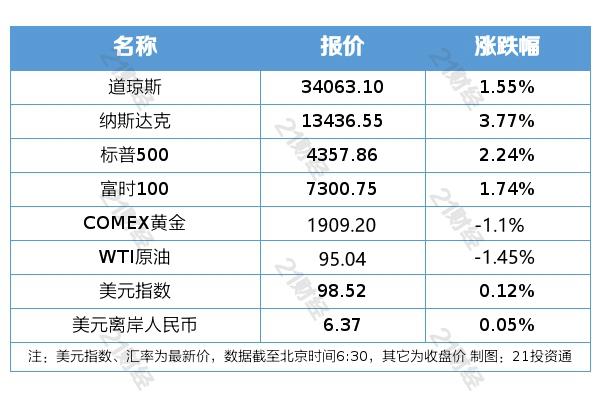 美国三大股指收涨。标普500指数收涨2.24%,报4357.86点。道琼斯工业平均指数收涨1.55%,报34063.10点。纳斯达克综合指数(纳指)收涨3.77%,报13436.55点。热门中概股大涨,纳斯达克金龙中国指数收涨33%。知乎涨超80%,金山云涨超72%,叮咚买菜涨超65%,欢聚涨超67%,斗鱼涨超60%,拼多多涨超56%,爱奇艺涨超50%,哔哩哔哩涨超47%,京东、百度、虎牙涨近40%,阿里巴巴涨超36%。