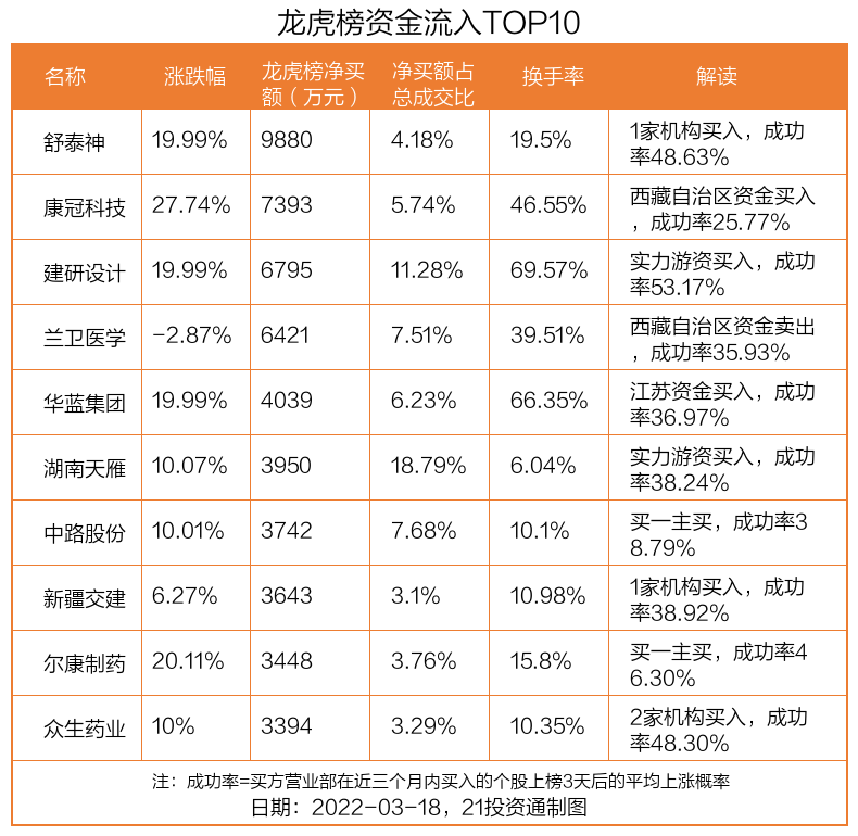 3月18日,上证指数上涨1.12%,深证成指上涨0.31%,创业板指上涨0.11%。盘后龙虎榜数据显示,共有43只个股因当日异动登上龙虎榜,资金净流入最多的是舒泰神(300204.SZ),达0.99亿元。