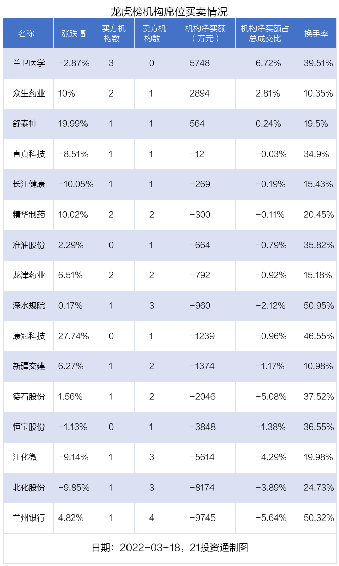 3月18日,16只个股龙虎榜出现了机构的身影,机构合计净卖出2.58亿元。具体来看,机构净买入3股,净卖出13股。