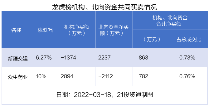 值得注意的是,机构和北向资金在新疆交建、众生药业上出现分歧,机构净卖出新疆交建1373.83万元,北向资金净买入2237.33万元;机构净买入众生药业2893.68万元,北向资金净卖出2111.59万元。