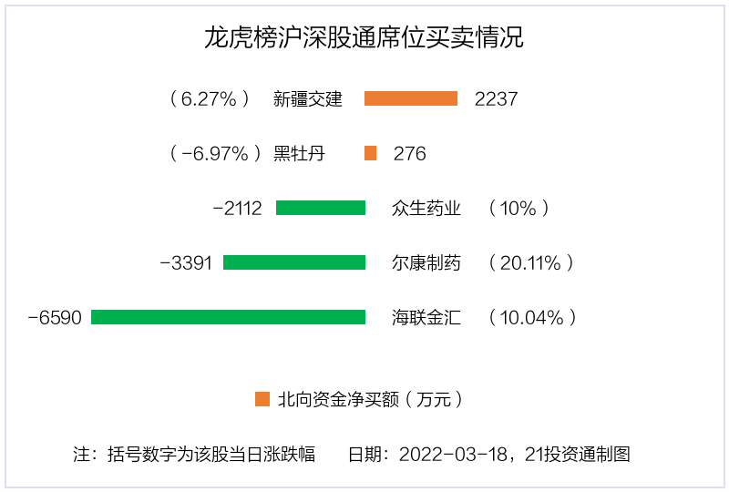 3月18日,北向资金参与龙虎榜中的个股共有5只,合计净卖出9578.71万元。其中沪股通净买入1 股,金额为276.4万元;深股通净买入1 股,净卖出3 股,合计净卖出9855.11万元。