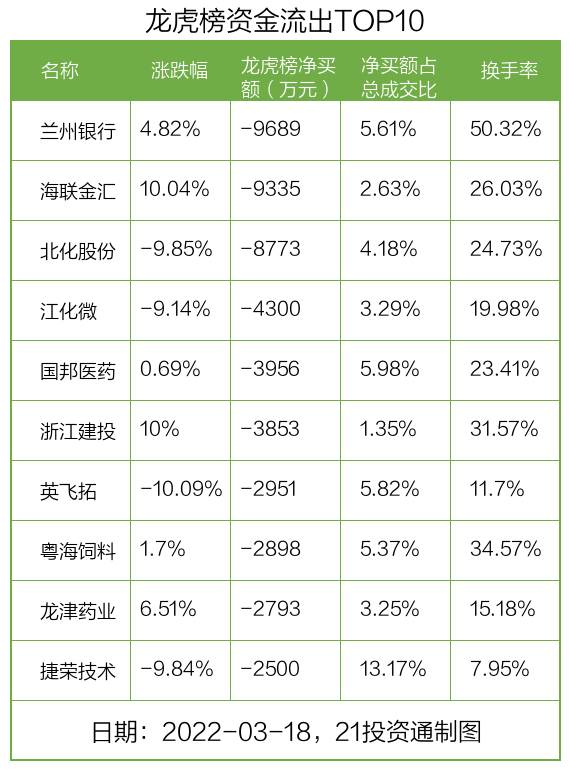 而龙虎榜中资金净流出最多的是兰州银行(001227.SZ),被净卖出0.97亿元,占总成交金额的5.61%。兰州银行收盘上涨4.82%,换手率为50.32%。