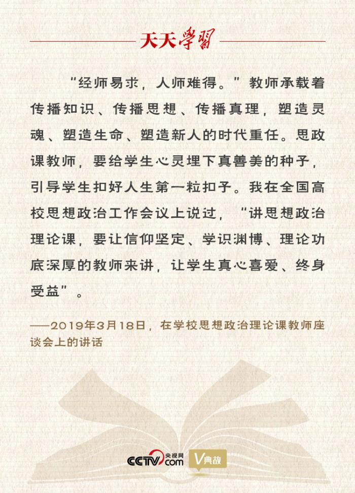 教师是立教之本、兴教之源,办好思想政治理论课关键在教师。一位好老师不但是知识的传播者,更是崇高理想和高尚道德的培育者、学生成才的引路人。要用中国梦打牢广大青少年的共同思想基础,教育和帮助青少年树立正确的世界观、人生观、价值观,永远热爱我们伟大的祖国,永远热爱伟大的中国共产党,永远热爱我们伟大的人民,永远热爱我们伟大的中华民族,坚定跟着党走中国道路。