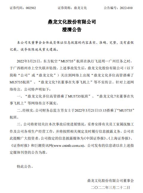 鼎龙文化发布澄清声明:公司财务总监搭乘失事航班