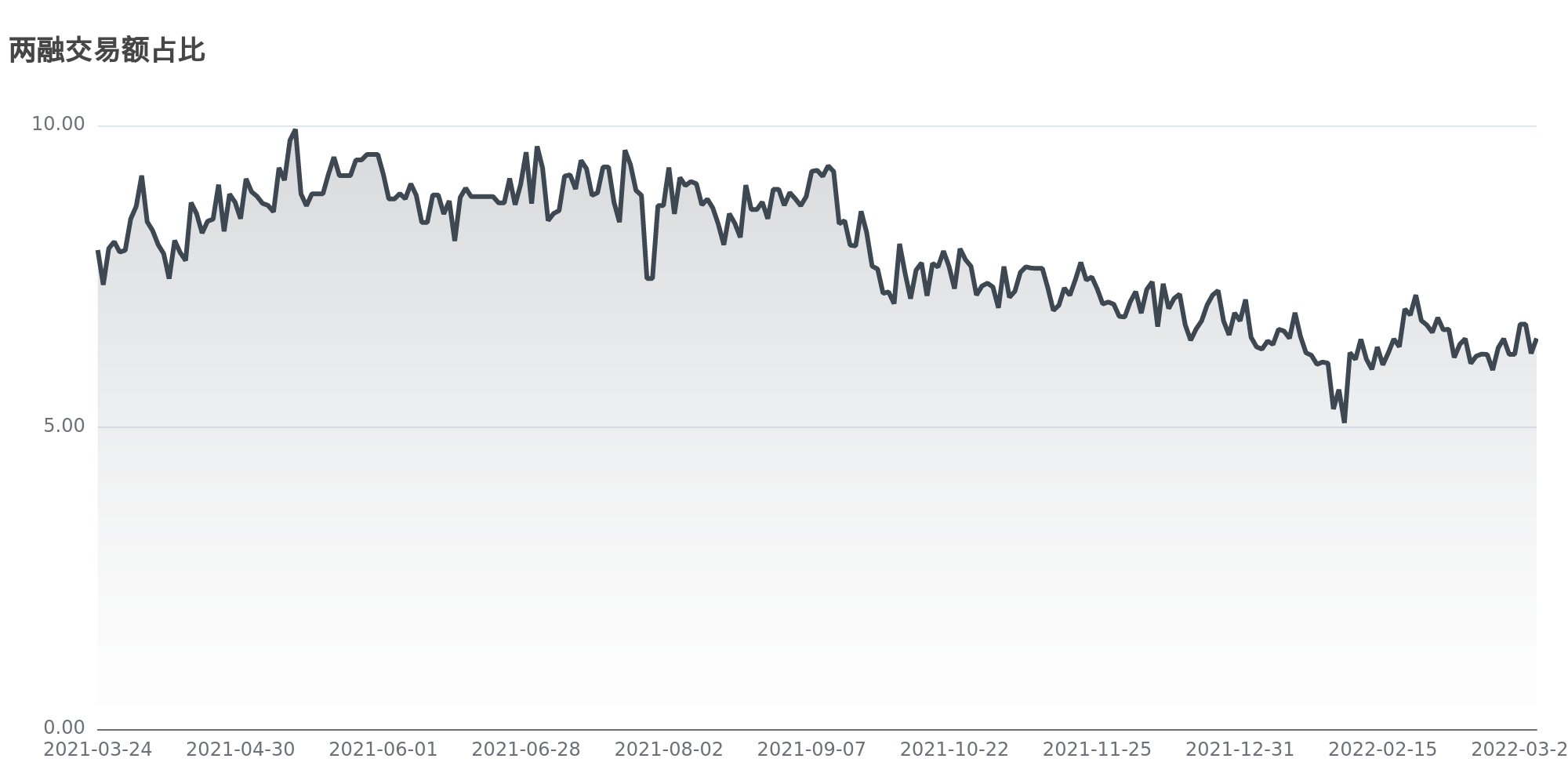 今日该指标值为6.47%,目前该指标处于近一年较低区间,说明投资者认为A股市场趋于触底反弹。反映场内投资者借钱炒股的杠杆水平,该指标越高说明杠杆水平越高,即投资者认为当前市场较强,反之则说明投资者认为市场相对较弱,因而与上证指数存在较强的正相关性。