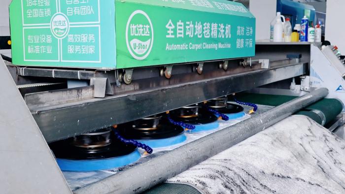 而一旁的全自动地毯精洗机,能清洗宽3.2米的地毯。“可以满足90%以上家用地毯的清洗需求,在整个湖北市场,就我们这一台。”毛阳城说。