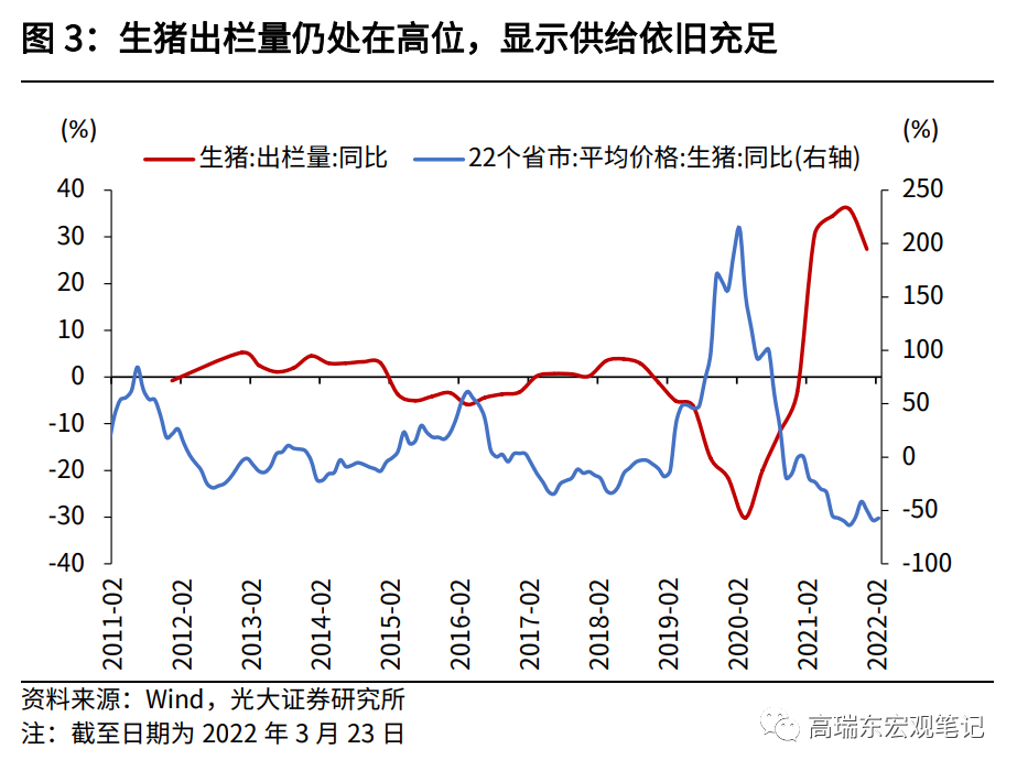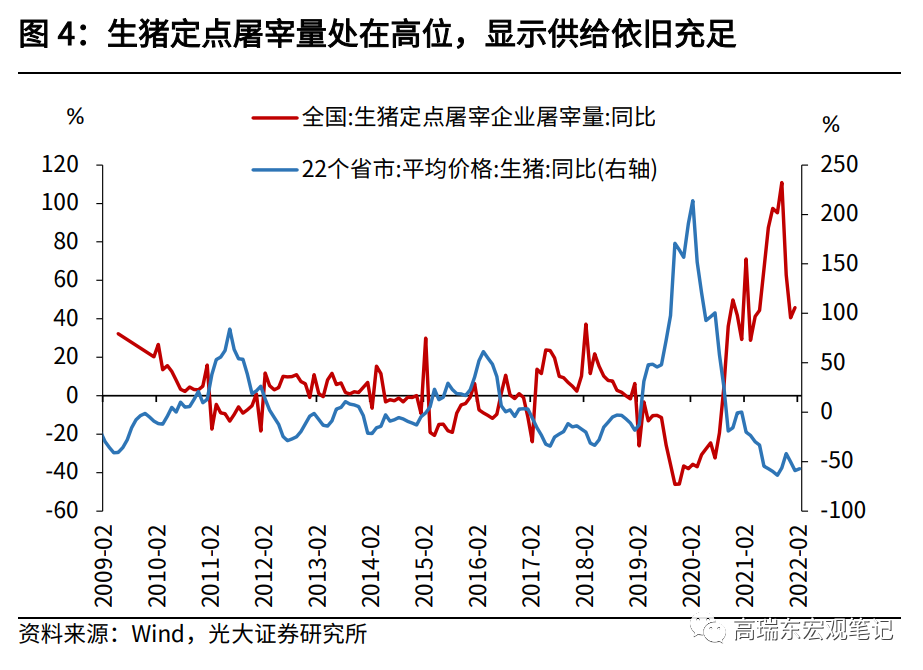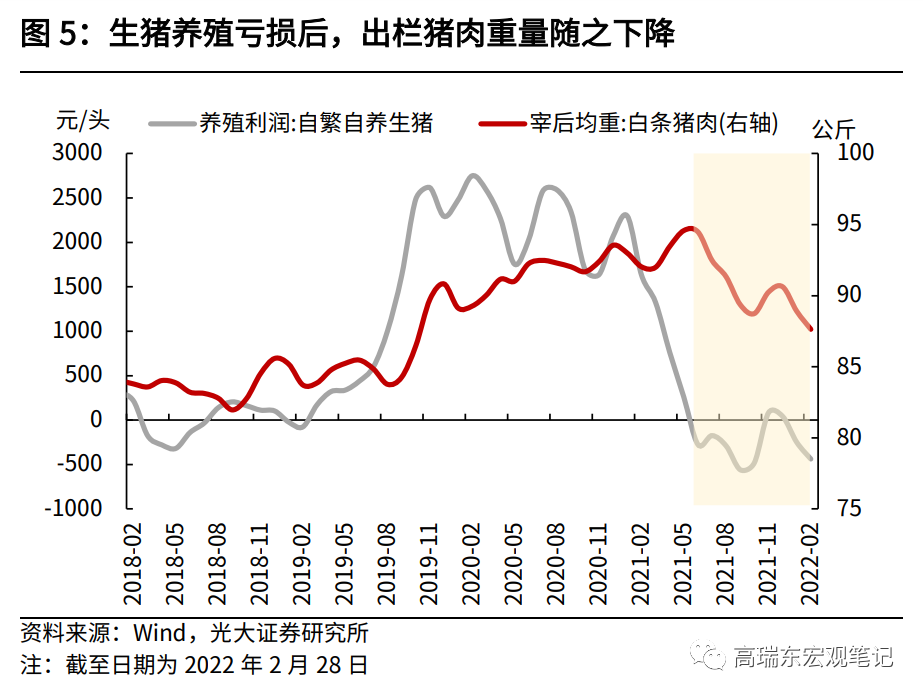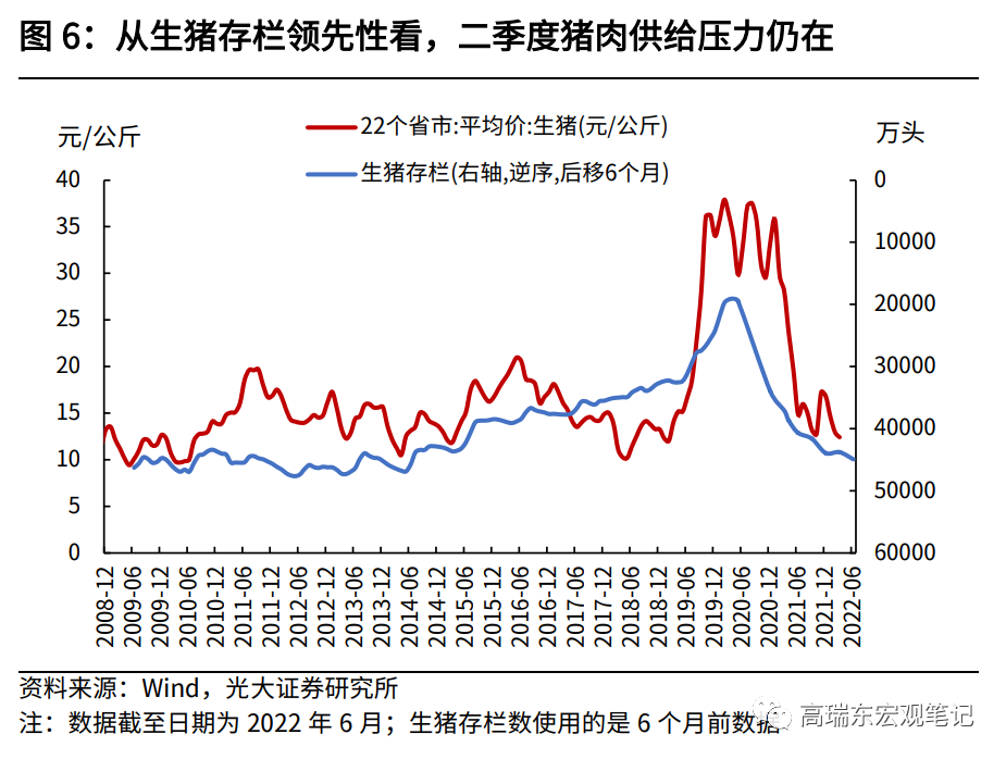 短期来看,市场仍处在供过于求的阶段,猪价继续承压。一是,国内疫情反复,导致餐饮需求减弱,将压低猪肉需求;二是,从屠宰量、生猪出栏量等同步指标来看,猪肉实际供给并未减少,生猪出栏体重也在下降,说明在当前深度亏损的情况下,养殖户出栏意愿相对较强;三是,从生猪存栏领先生猪供给6个月的规律性看,二季度猪肉供应仍会增加,预计同比增长11%,但考虑到今年生猪出栏体重较上年同期下降5%,将部分缓解猪肉供给增加带来的猪价下降压力。
