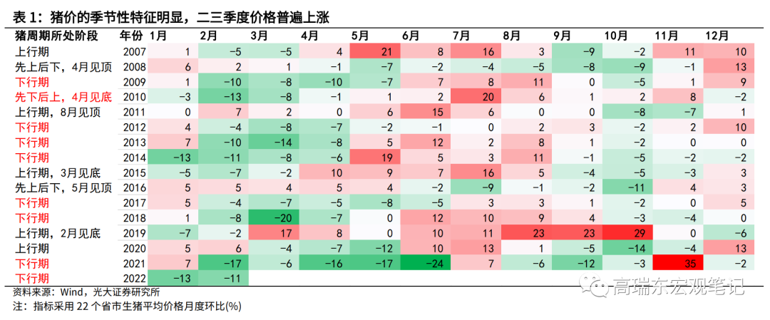 从历次猪周期开启的时点来看,2010、2015、2019年猪价开启上涨都出现在一/二季度。其背后反映的是猪肉需求季节性回升的规律,也为猪周期开启提供规律性时点。从2007年至今,观察猪价的季节性波动情况看,每年2、3月份都是猪价跌幅最大的时期,二季度起猪价跌幅收敛或开始上涨。
