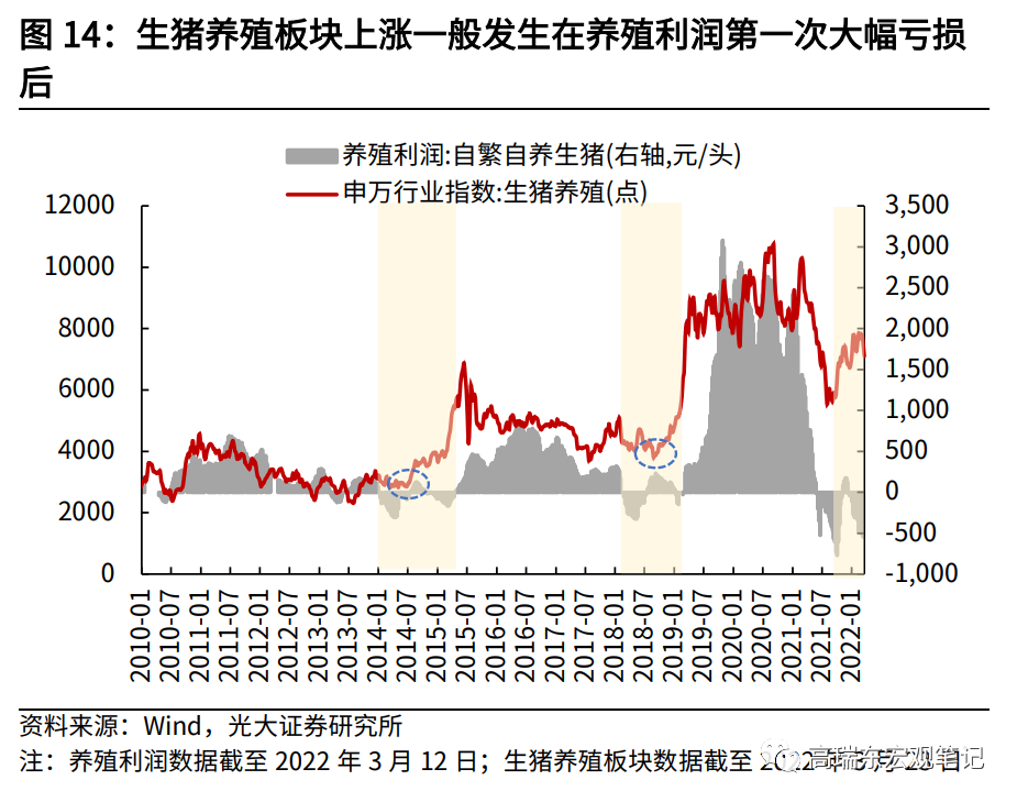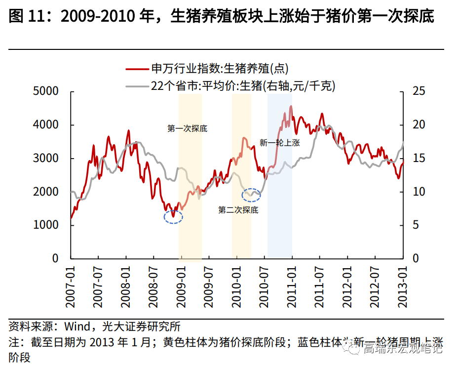 生猪养殖板块第一轮上涨,一般发生在猪价跌破成本线之后,能繁母猪存栏开始回落,此时市场会提前反映未来猪价上涨的预期,而此时猪价仍处在探底过程中。这是由于能繁母猪的存栏数直接取决于养殖利润的大小,当养殖利润跌入0以下时,即猪价跌破成本线时,养殖户无利可图,才会开始减少存栏数。但由于生猪养殖周期的存在,此时生猪供给仍在高位,推动价格进一步回落,因此出现猪价下跌与生猪养殖板块上涨阶段性并存的情况。