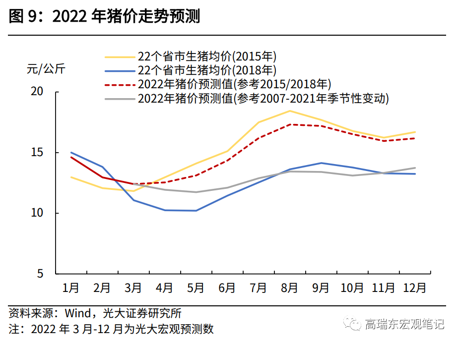 我们参考2015、2018年猪价反弹高度和节奏,拟合出2022年猪价走势,作为中性情景下的预测值。预计2022年,猪价将在二季度出现企稳回升,三季度反弹幅度较大,年末猪价较3月低点上涨30%,全年上涨22%,反弹幅度相对温和。