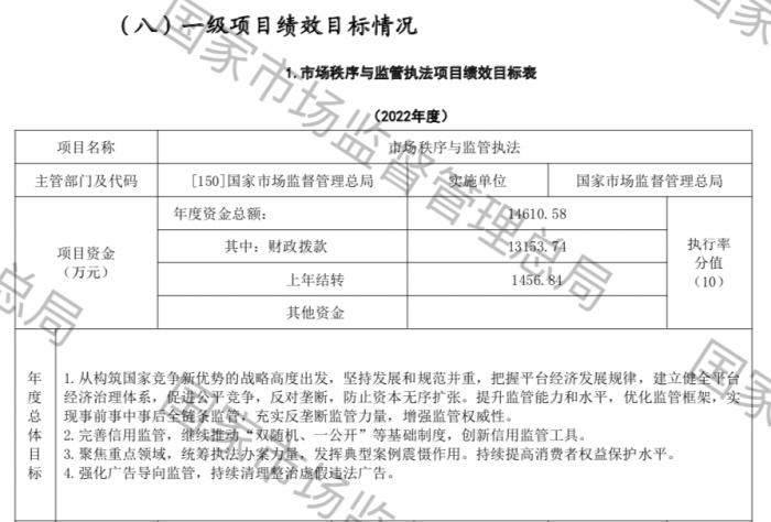 市场监管总局的一级项目绩效目标中包括了“市场秩序与监管执法项目绩效目标表(2022年度)”。 该项目年度资金总额为14610.58万元,也就是将近1.5亿,要求健全平台经济治理体系、完善信用监管以及加强广告导向监管。