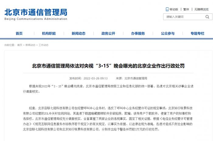 北京市通信管理局经充分调查核实,全面掌握了两家企业的违规事实,固定了相关证据,根据《电信业务经营许可管理办法》《规范互联网信息服务市场秩序若干规定》的有关规定,以事实为依据、以法律法规为准绳,迅速对造成不良社会影响的北京容联七陌科技有限公司和北京知行锐景科技有限公司,分别作出给予警告并罚款3万元的行政处罚。