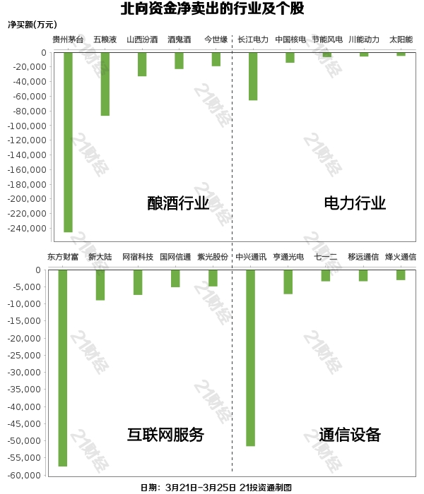 其中,贵州茅台被净卖出24.57亿元,五粮液被净卖出8.68亿元,中国平安被净卖出7.79亿元,长江电力被净卖出6.58亿元,东方财富被净卖出5.75亿元。