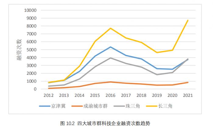 沿海地区省市因经济发展较快,政策引导力度大,往往能够吸引更多的资金和人才聚集,而融资能力的提升又反哺企业提高自身科技实力。启信宝报告显示,从2012至2021十年间,我国科技企业融资次数TOP5城市分别是:北京、上海、深圳、杭州和广州,总体上看长三角城市群企业融资环境较好,在全国处于优势地位。
