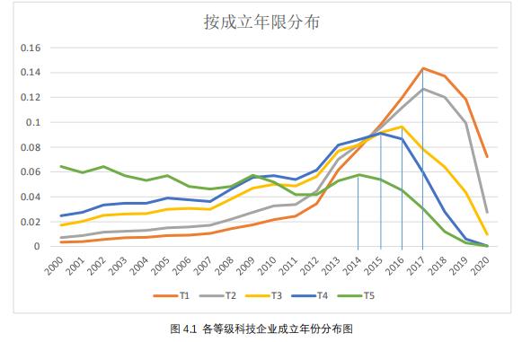 按照企业科技实力的量化评分体系,启信宝将全国科技企业划分为5个等级(T1、T2、T3、T4、T5),分数越高,获得的等级越高,表明企业的科技实力越强。以T4企业(在行业内表出的科创能力为良好)为例,该等级企业平均成长周期为6年,若一个城市的T4企业平均成长周期小于6年,说明该城市的科技创新环境较好,科技企业发展速度也较快。