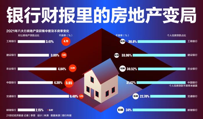 截至目前,包括六大行、八家股份行2021年年报已经披露,总体来看,有12家银行对公房地产贷款占比出现下降,个人住房贷款占比则有升有降;12家银行对公房地产贷款资产质量下行,个人住房贷款资产质量则有升有降。