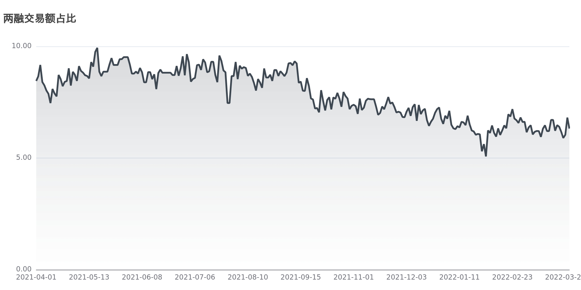 今日该指标值为6.32%,目前该指标处于近一年较低区间,说明投资者认为A股市场趋于触底反弹。反映场内投资者借钱炒股的杠杆水平,该指标越高说明杠杆水平越高,即投资者认为当前市场较强,反之则说明投资者认为市场相对较弱,因而与上证指数存在较强的正相关性。