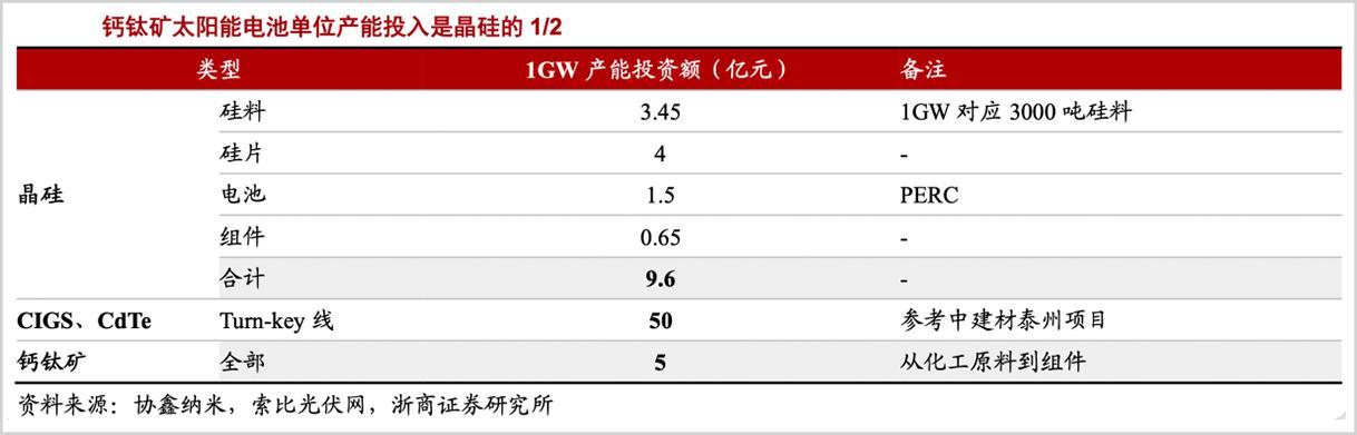 光伏企业投资1GW晶硅电池,需要从硅料、硅片、电池、组件合计超过9亿元;而协鑫纳米披露的数据显示,其建造的钙钛矿百兆瓦产线投资为1亿元,1GW的投资仅为5亿元。也就是说,1GW钙钛矿电池的投资强度仅为晶硅的一半。