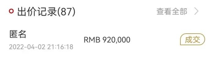 中新财经记者注意到,开拍仅1小时后,金墩墩叫价已达1.7万元,当晚竞价至17万元,4月1日已有买家出价到30万元。4月2日晚临近截拍时,多位买家参与竞价。出价记录显示,叫价从30余万元一路上涨至92万元,金墩墩最终被匿名账号拍下。