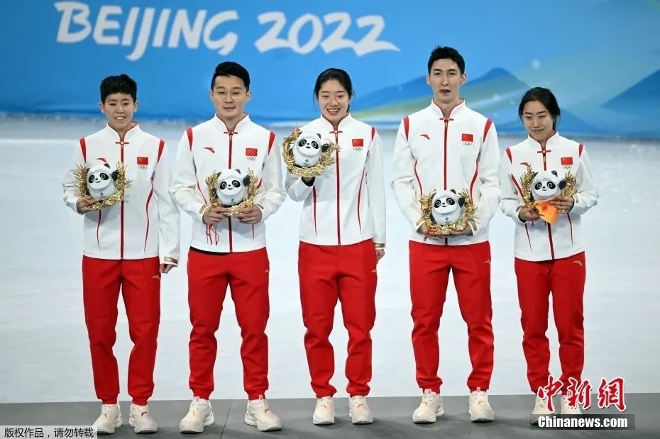 在2月5日晚结束的短道速滑混合团体接力决赛中,由武大靖、任子威、范可新、曲春雨组成的中国队率先冲过终点,为中国体育代表团拿到本届冬奥会首枚金牌。图为赛后中国队队员手捧冰墩墩合影。