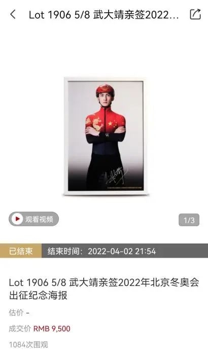 除此之外,同场拍卖的8幅武大靖亲笔签名海报均以高于5000元的价格落槌。其中落槌价最高的一幅达9500元。