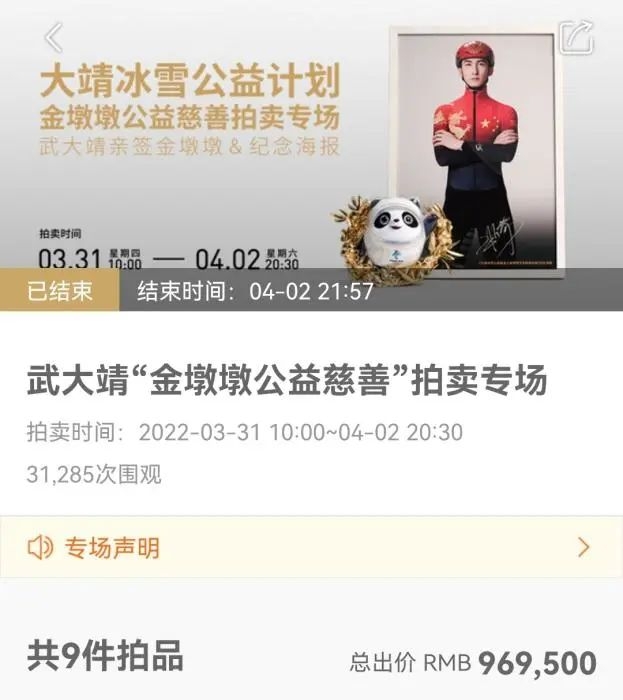 另据此前报道,在本场慈善拍卖结束后,所筹善款将直接捐赠至大靖冰雪公益计划。除了本次的拍卖所得,武大靖个人还将额外向大靖冰雪公益计划捐款10万元人民币。