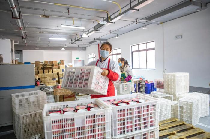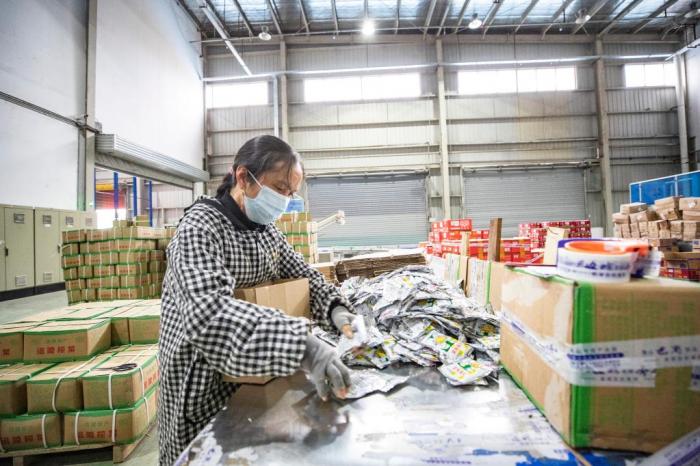 3月24日,在重庆市秀山土家族苗族自治县现代物流园内,一家企业的员工在搬运包装好的方便食品。