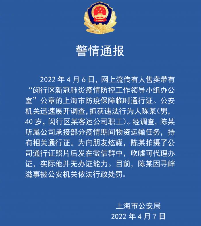 据上海警方通报,2022年4月6日,网上流传有人售卖带有“闵行区新冠肺炎疫情防控工作领导小组办公室”公章的上海市防疫保障临时通行证。公安机关迅速展开调查,抓获违法行为人陈某(男,40岁,闵行区某客运公司职工)。经调查,陈某所属公司承接部分疫情期间物资运输任务,持有相关通行证。为向朋友炫耀,陈某拍摄了公司通行证照片后发在微信群中,吹嘘可代理办证,实际他并无办证能力。