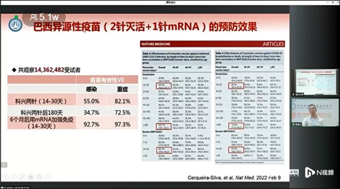 课程中,钟南山分享了在巴西开展的异源性疫苗(2针灭活+1针mRNA疫苗)接种的真实世界数据。该研究共观察1436万受试者,发现,接种两针灭活疫苗后,第三针改为接种mRNA疫苗的,对感染和重症的预防作用(相对接种灭活疫苗)都有明显的增加。▼