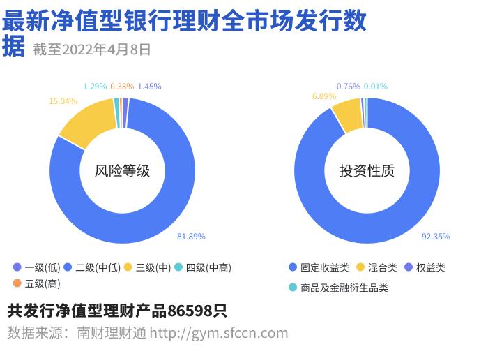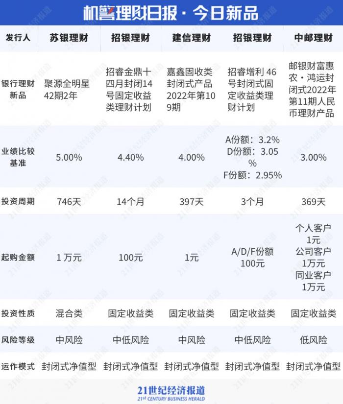 南财理财通课题组选取5只近期发售的封闭式净值型产品供参考。据南财理财通数据显示,近期,招银理财“招睿金鼎十四月封闭14号固定收益类理财计划”值得关注。该产品业绩比较基准为年化4.4%,投资性质为固定收益类,运作模式为封闭式净值型,投资周期为14个月,该产品起购金额100元,风险等级为中低风险。该产品的募集期为2022年4月8日至2022年4月14日。