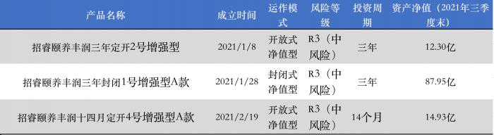 从资产规模看,截至2021年9月30日,“招睿颐养丰润三年封闭1号增强型A款”资产净值最高,为87.95亿元,“招睿颐养丰润十四月定开4号增强型A款”和“招睿颐养丰润三年定开2号增强型”资产净值分别为14.93亿元和12.30亿元。
