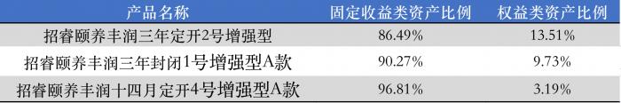 从权益仓位看,根据产品2021年三季度运作报告,“招睿颐养丰润三年定开2号增强型”的权益仓位最高,为13.51%,而“招睿颐养丰润三年封闭1号增强型A款”和“招睿颐养丰润十四月定开4号增强型A款”的权益仓位分别为9.73%和3.19%。
