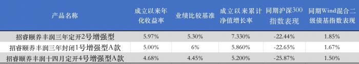 招银理财“招睿颐养丰润三年定开2号增强型”和“招睿颐养丰润十四月定开4号增强型A款”运作模式均为开放式净值型,投资周期分别为3年和14个月;“招睿颐养丰润三年封闭1号增强型A款”运作模式为封闭式净值型,投资周期为3年。三款产品风险等级均为R3(中风险)。