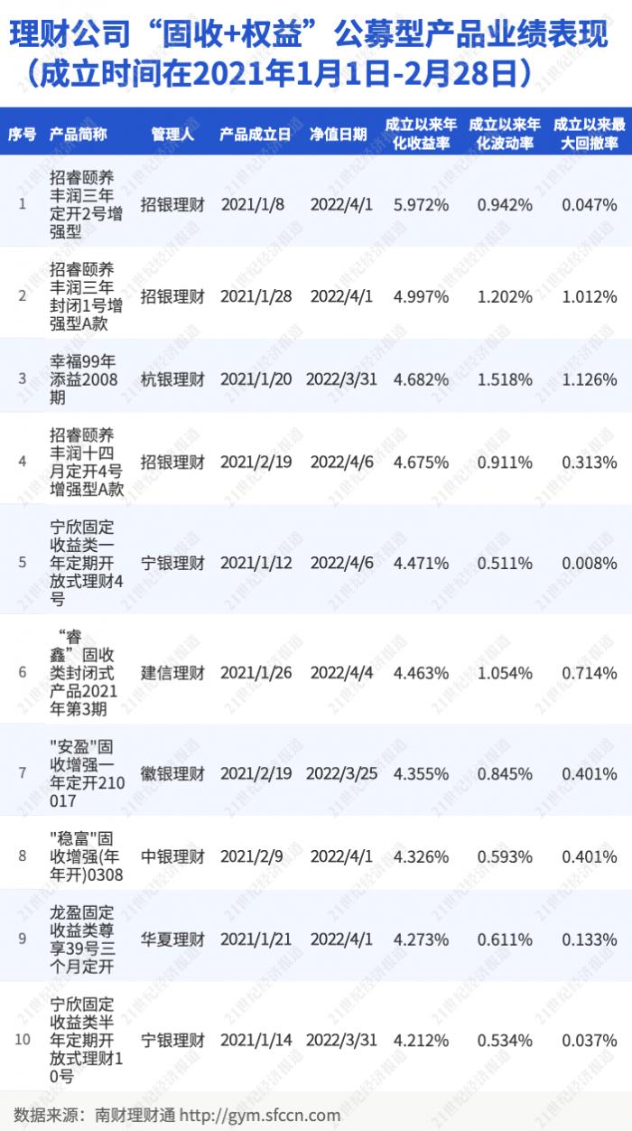 理财公司“固收+权益”公募型产品成立以来业绩表现(成立时间在2021年1月1日-2月28日)