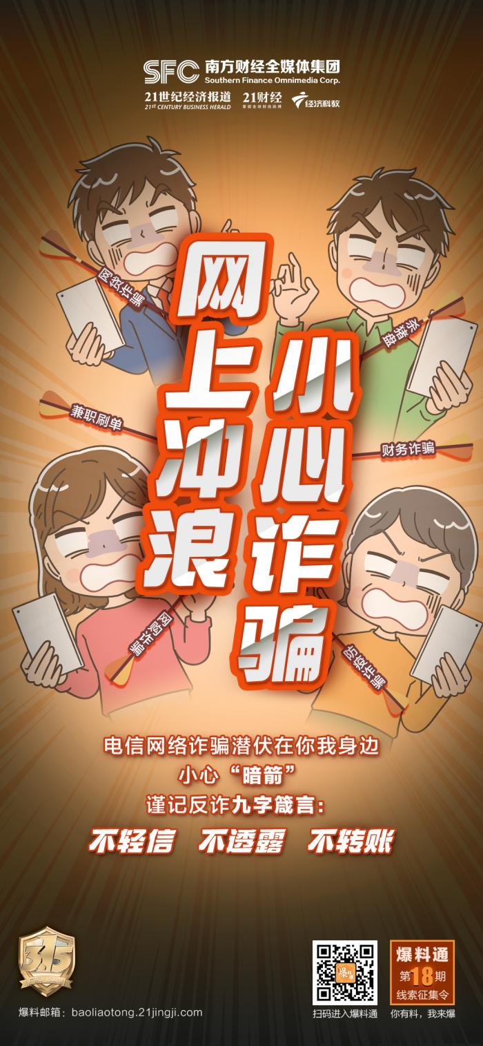 时刻保持警惕,提高反诈意识。21财经客户端#爆料通#联合广东经济科教频道、2022广东3·15晚会节目组邀你一同关注电信网络诈骗,如果你有任何相关新闻线索,可以登录爆料通(点击进入平台)反馈,或发送至“爆料通”官方邮箱:baoliaotong@21jingji.com,你有“料”,我来爆!