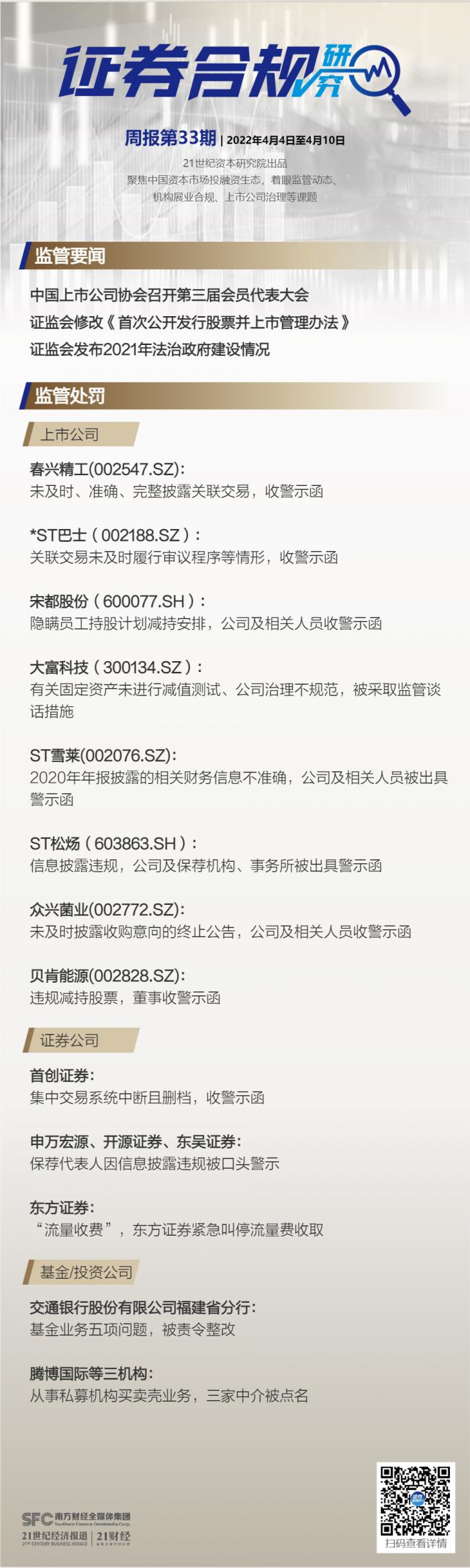 4月8日,证监会发布2021年法治政府建设情况。证监会表示,2022年,证监会将持续深入推进资本市场法治政府建设;持续深化以全面实行股票发行注册制为主线的资本市场改革,进一步加强资本市场基础制度建设;突出放管结合,认真履行监管职责,引导、鼓励市场产品创新;严格落实《关于依法从严打击证券违法活动的意见》,健全证券执法司法体制机制,严厉打击资本市场违法行为;为打造一个规范、透明、开放、有活力、有韧性的资本市场。