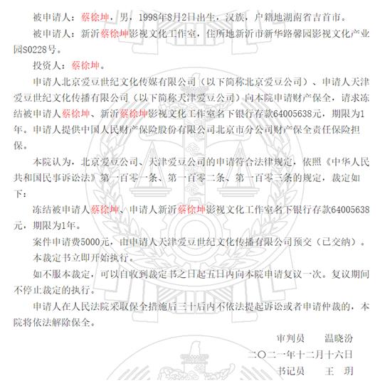 此前,根据中国裁判文书网显示,近日,北京爱豆世纪文化传媒有限公司、天津爱豆世纪文化传播有限公司与新沂蔡徐坤影视文化工作室非诉财产保全审查裁定书公开。