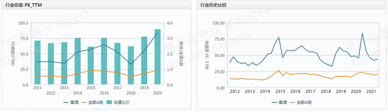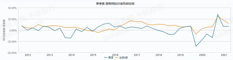 从行业估值和历史比较来看,黄酒的估值普遍比A股高,总体趋势呈现先估值降低后升高的状态。单季度营收同比行业历史比较与全部A股趋势较为一致。