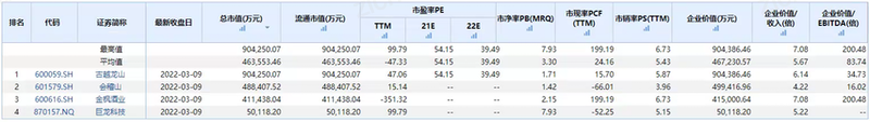 表 中国上市行业公司估值对比